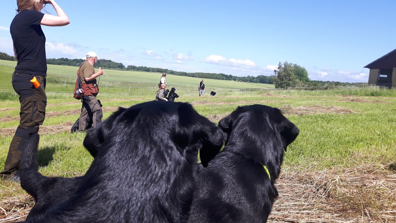 Lördagen började även denna med en simtur dagen till ära i ett ankhål och lite senare blev det linjeträning här hemma. Den här gången var uppslutningen riktigt bra och vi var 9 st som gick fram och tillbaka i hagen. Bonden hade gödslat stora fältet så där var väll ingen direkt road av att gå. Så vi gick i den stora backhagen på baksidan. Fördelen med den hagen är att där är en svacka på mitten och när man skickar från ena toppen till den andra har man bra överblick över vad hunden gör fast att det en bit bort.
