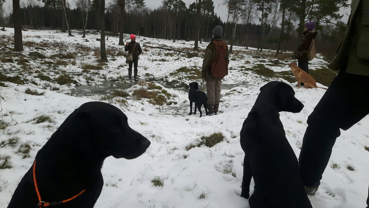 När Taggis hade lämnat av dummien så kastade Jens en ny dubbelmarkering. Ebbas hund fick hämta in en av markeringarna, sen sköt Jens ett nytt skott till Taggis linje. Den här gången låg där en liten dummie ett par meter bakom den första. Även denna gången höll han lite vänster i linjen så jag kallade in och skickade om. Andra skicket gick rakt ut och när han var i området blåste jag närsökssignal som han inte riktigt tog. Så jag kallade in igen och gick ut och satte honom där jag hade blåst signalen. Jag gick tillbaka en bit och blåste ny närsökssignal och han satt kvar som ett ljus och väntade. Det här är något vi ska träna på ett tag, att få honom att våga börja jobba direkt efter att han har fått ett sittkvar kommando. Andra gången jag blåste närsökssignal så började han jobba direkt och hittade dummien. När Taggis var tillbaka fick Ebbas hund ta den andra markeringen.