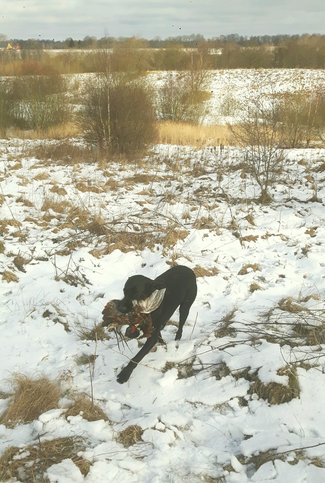 Full fart iväg, nästan lite för fort men ganska snabbt fick han vittring på ett vilt mitt i söket. Han följde upp vittringen bra, plockade upp det snabbt och hade full fart hela vägen tillbaka till mig. Avlämningen var bra och han fick sitta kvar framför mig medan viltet lades åt sidan. In till sidan och ut igen även denna gången var det full fart ut och han tog lite mer mark. Denna gången hittade han en and i ett par buskar. På det tredje skicket tog han sig över diket där han hittade ytterligare en and. Nu började han bli lite trött så till det fjärde skicket hade han ett behagligare tempo och nosen på direkt så då hittade han en av kråkorna som låg hyfsat nära skickepunkten. Den 5 e och sista kråkan tog lite längre tid men när han väl kom på rätt sida om kråkan i vinden så hittade han den med.