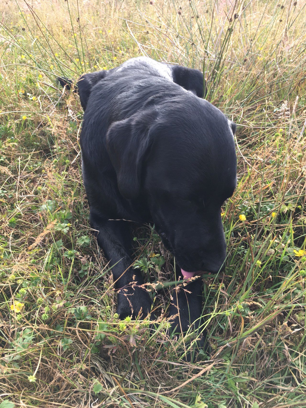 Pekövningen/solfjädern gick ut på att ställa upp dummisar som en solfjäder och skicka hunden på linje till en bestämd dummie. När en dummie var avlämnad kastade man ut den i området där den hade stått och skickade hunden på en ny som stod upp. Vi började ” enkelt” och skickade från ytterkanterna och in till mitten. Taggis hade lite problem med den siste, dels syntes den inte och sen skulle han springa mellan två som låg utkastade. Så jag fick gå lite närmre tills att han förstod vart han skulle springa.