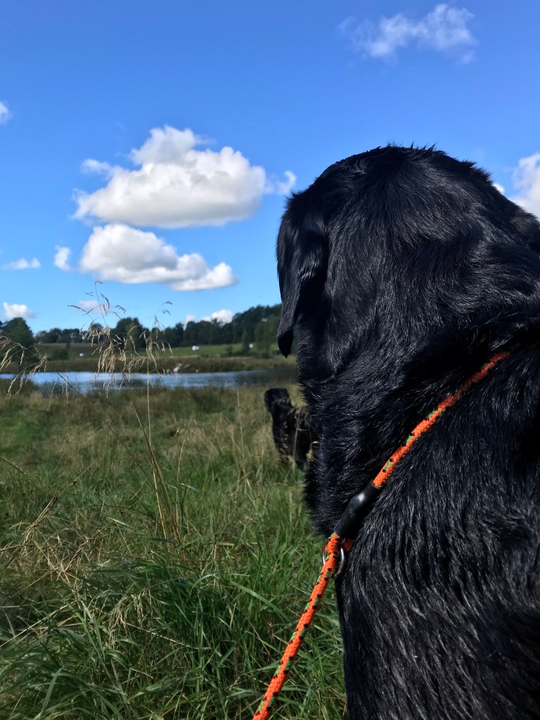 I lördags blev det linjeträning med Bea. Vi tränade på en mark med en stor svacka, platåer och buskar lite här och där. Vi la ut dummisar/bollar på 4 områden, både så att vi kunde stå på den ena sidan och skicka ner i svackan och upp på andra sidan och där vi kunde stå längst ner i svackan och antingen skicka upp eller längs med.