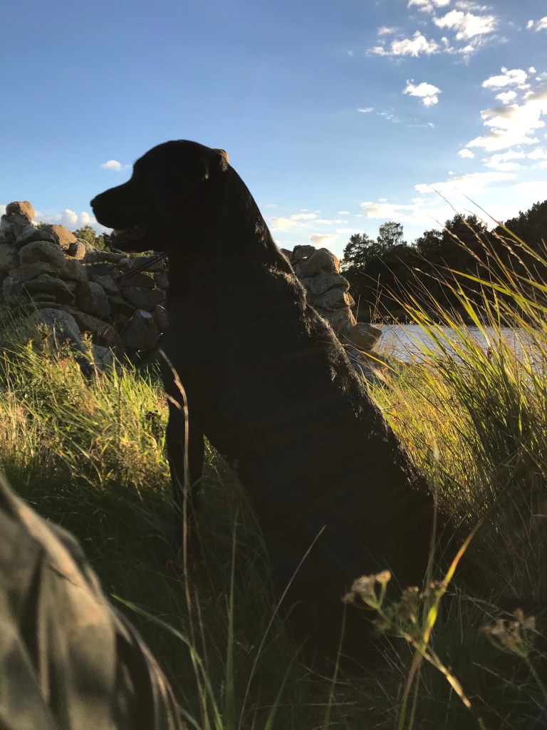 Jag fick till en kanon dirigering som kändes riktigt jäkla bra. Jag skickade honom på en linje, han föll lite åt höger och när jag blåst stopp föll en fågel 20-30 meter till höger honom. Till min förvåning satt han kvar, den retningen brukar han inte klara av, och jag skickade honom på ett ut med vänsterhand upp. Hans lätta sida förvisso, men han gjorde en klockren vändning åt vänster gick bakåt och när han var i rätt område fick han ett kort stopp och närsök (såg att han fick vind på fågeln) att han vände bort från den fallna fågeln och fortsatte följa mina tecken och signaler kommer jag leva länge på 🤩